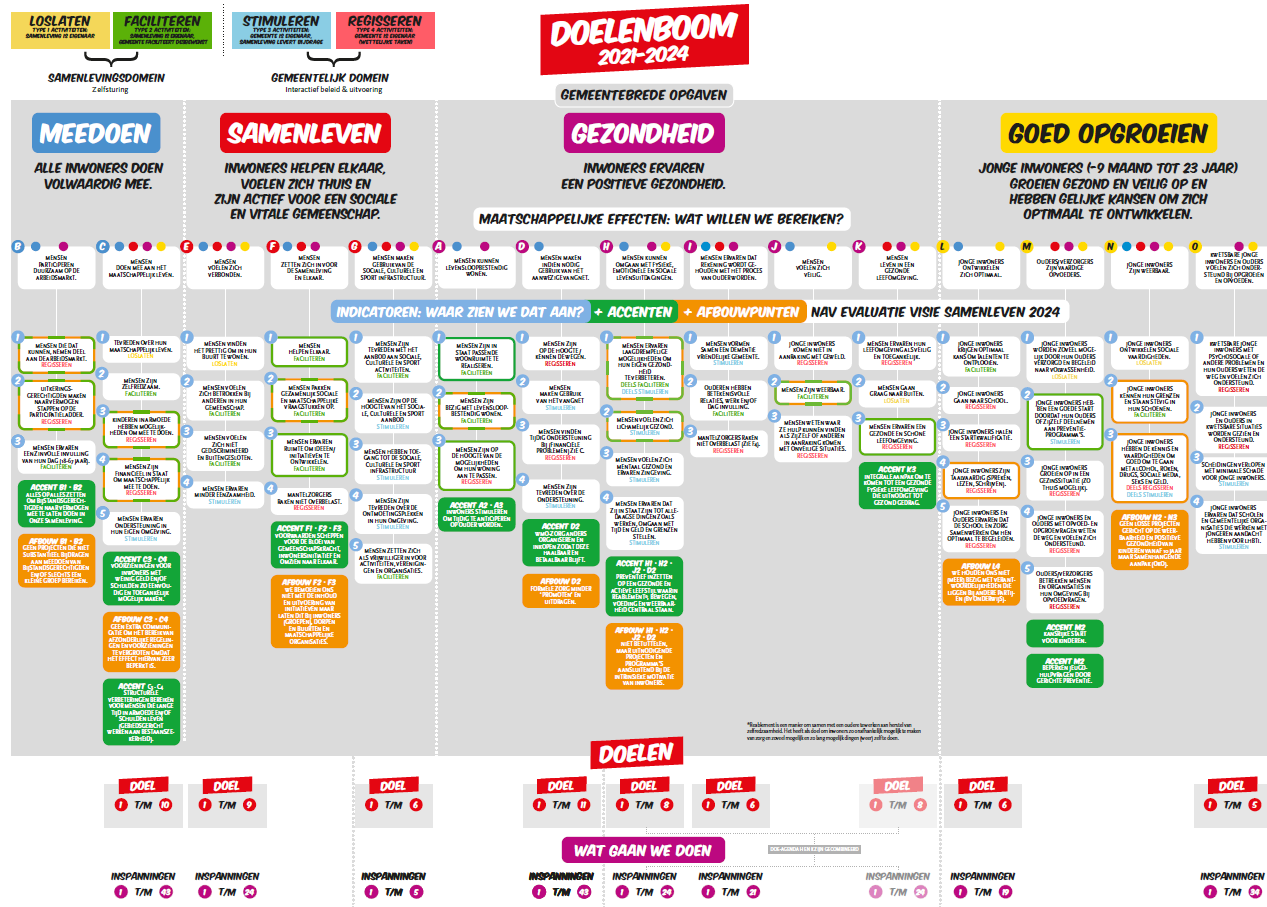 De doelenboom is naar aanleiding van de Tussenbalans aangepast. De aangepaste doelenboom vindt u hieronder en in groter formaat op https://www.ooststellingwerf.nl/visie-samenleven. Zie ook paragraaf 10.
